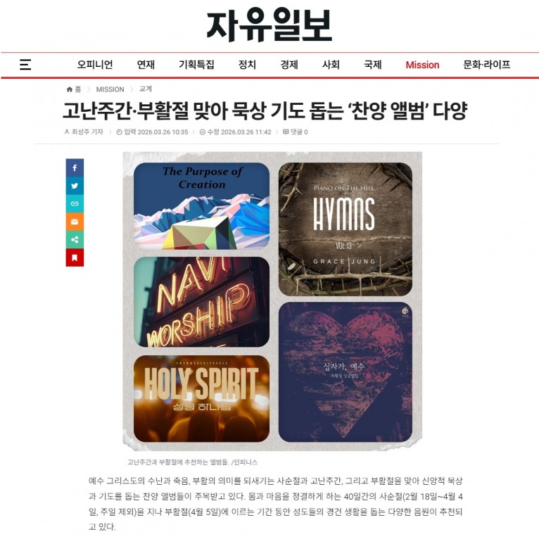 뮤직타임 [기획기사] 고난주간·부활절 맞아 묵상 기도 돕는 ‘찬양 앨범’ 다양(자유일보)