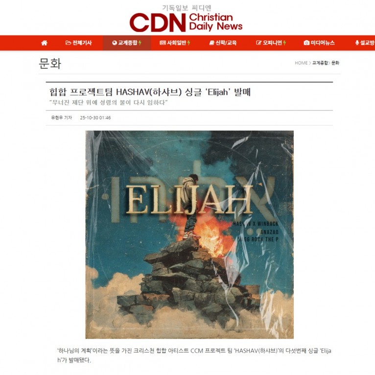 [기사] 힙합 프로젝트팀 HASHAV(하샤브) 싱글 ‘Elijah’ 발매(기독일보 씨디엔)